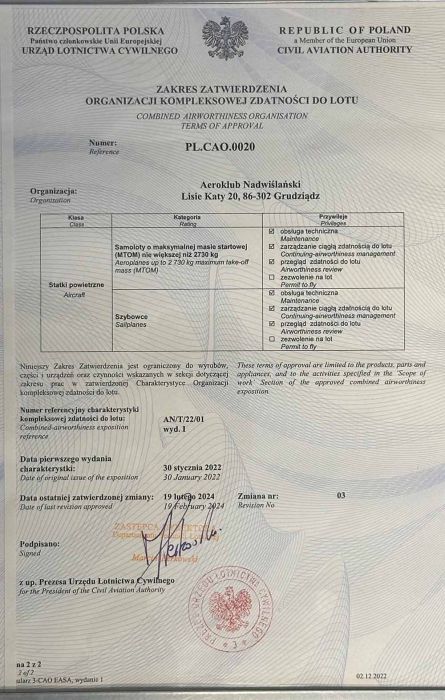 Aeroklub Nadwiślański jest certyfikowaną Organizacją CAO, zatwierdzoną przez Prezesa ULC (PL.CAO.0020).
